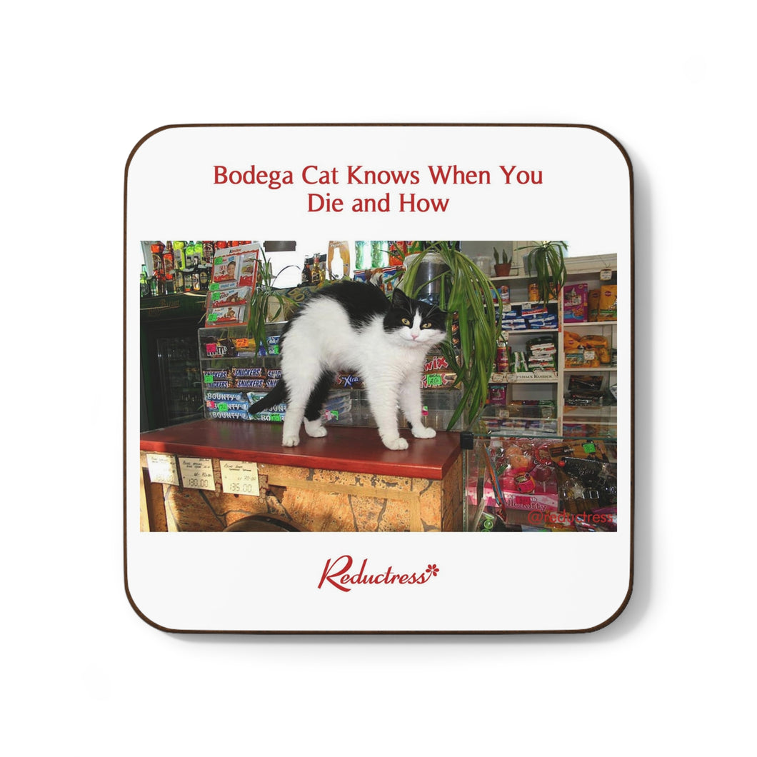 "Bodega Cat Knows When You Die and How" Hardboard Back Coaster