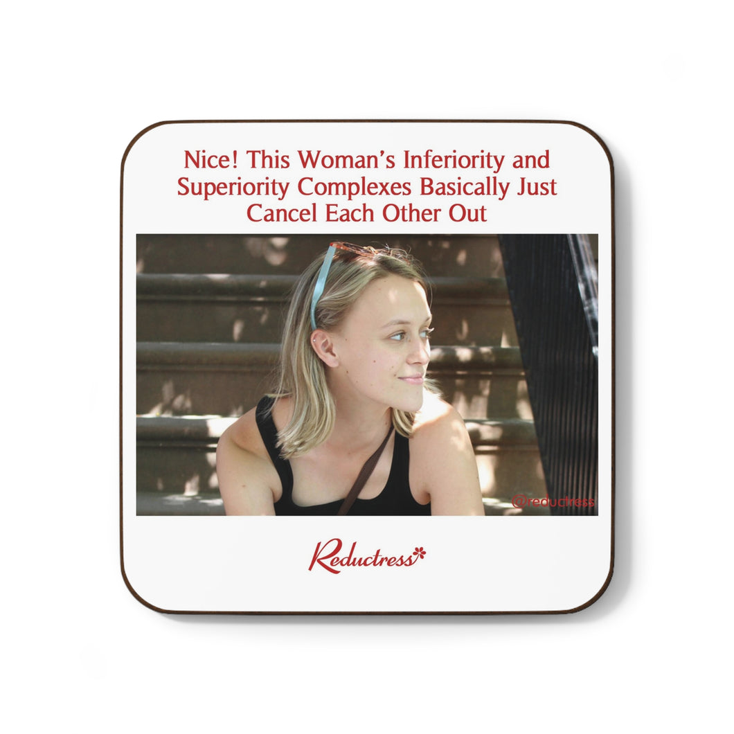 "Nice! This Woman’s Inferiority and Superiority Complexes Basically Cancel Each Other Out" Hardboard Back Coaster